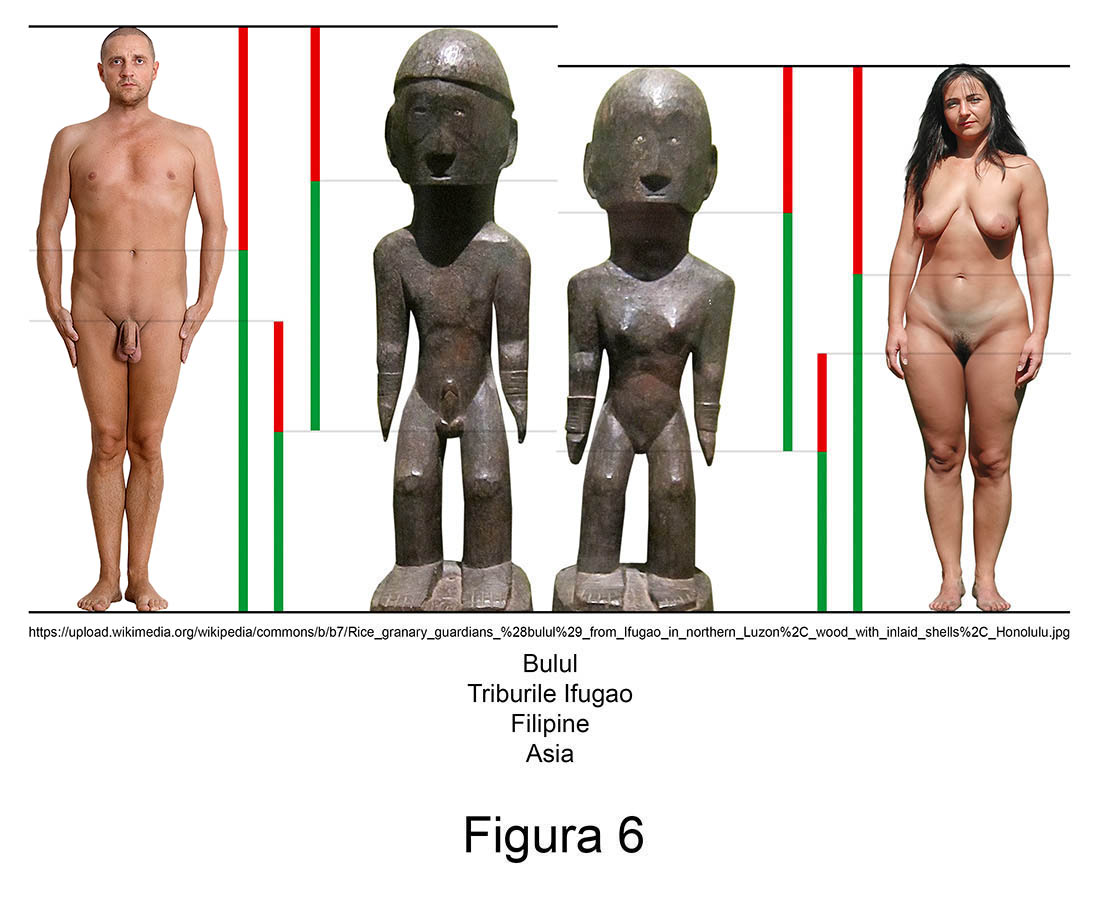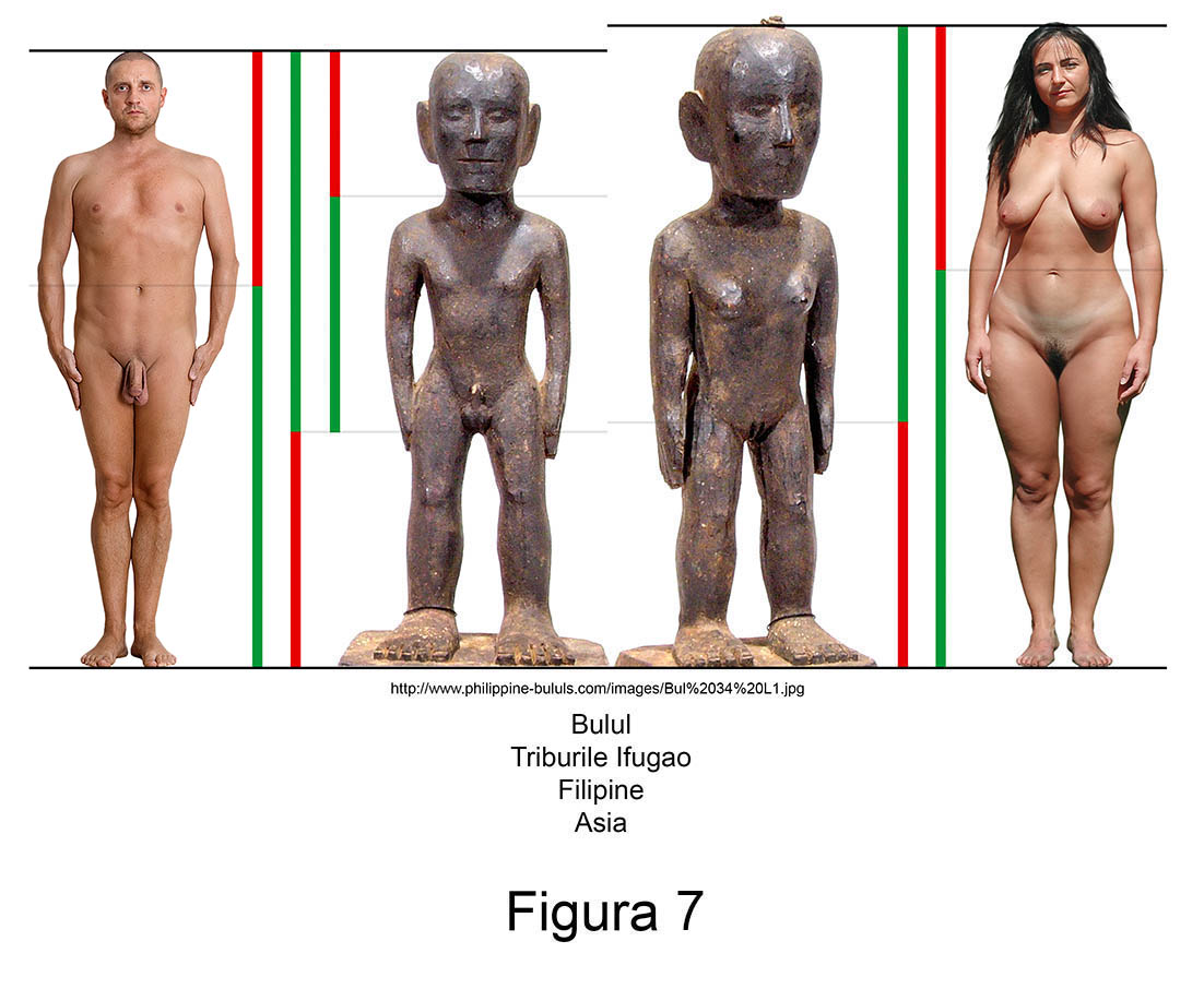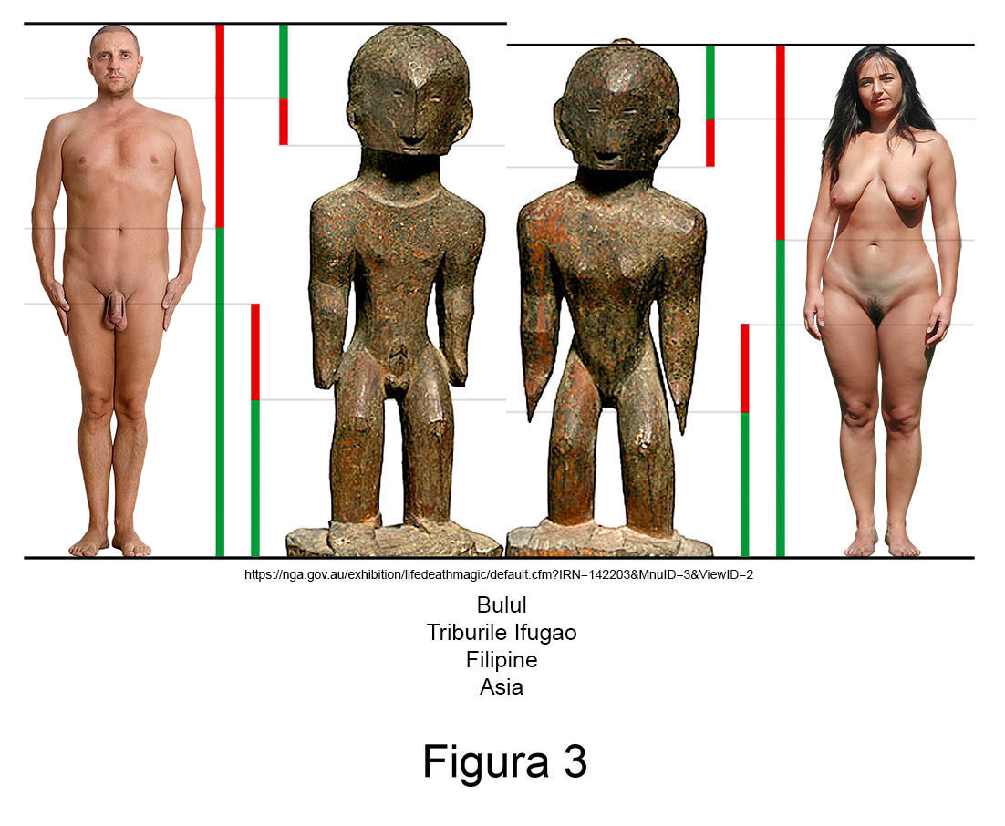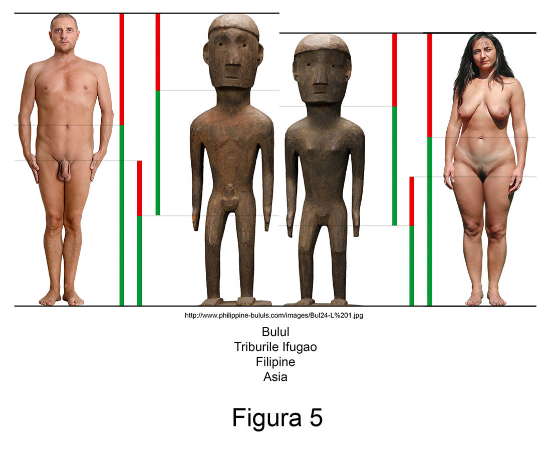 Sculptura primitivă contemporană conține în mod recurent abateri de aur. Larg răspândite în nordul arhipelagului filipinez, triburile Ifugao venerează de secole zeități ale orezului numite Bulul. Așa cum se poate observa în măsurătorile alăturate, figurinele din lemn ale acestor idoli reprezintă exemple relevante pentru ambele sexe.