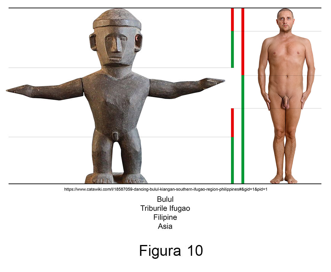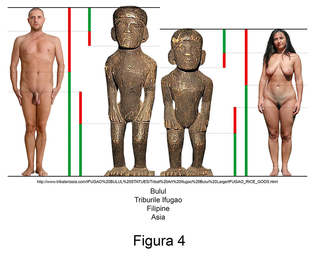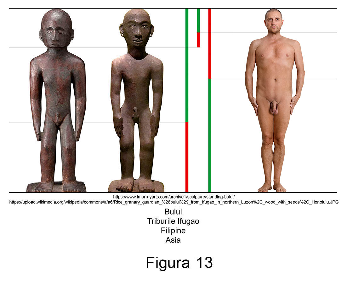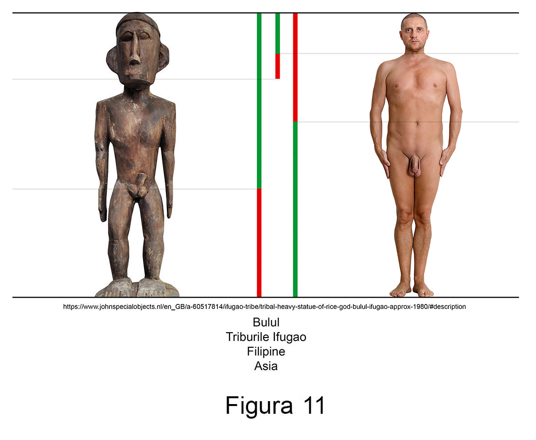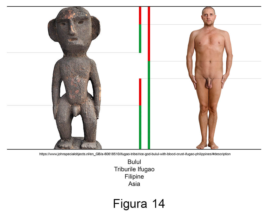 Sculptura primitivă contemporană conține în mod recurent abateri de aur. Larg răspândite în nordul arhipelagului filipinez, triburile Ifugao venerează de secole zeități ale orezului numite Bulul. Așa cum se poate observa în măsurătorile alăturate, figurinele din lemn ale acestor idoli reprezintă exemple relevante pentru ambele sexe.
